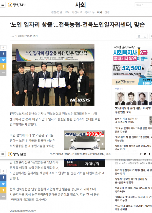 2017-03-15 중앙일보-'노인 일자리 창출'...전북농협-전북노인일자리센터, 맞손